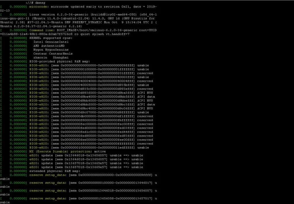 El uso del comando dmesg, el objetivo mensaje de dianostico. es ofrecer al usuario los mensajes generado en momento del arranque del sistema y lo producido por las aplicaciones y el propio sistema durante su funcionamiento. por eso es tan imporante, cuando el equipo no funciona como lo deseamo.